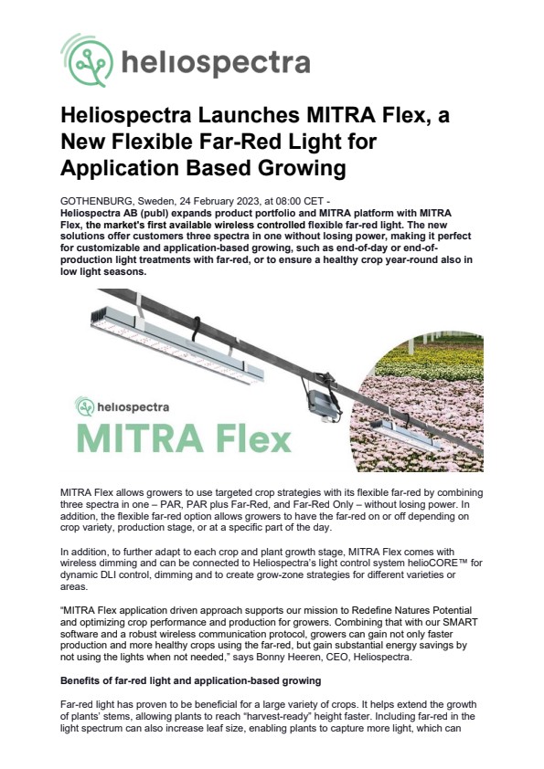 Heliospectra AB (publ) expands product portfolio and MITRA platform with MITRA Flex, the market’s first available wireless controlled flexible far-red light. The new solutions offer customers three spectra in one without losing power, making it perfect for customizable and application-based growing, such as end-of-day or end-of-production light treatments with far-red, or to ensure a healthy crop year-round also in low light seasons.