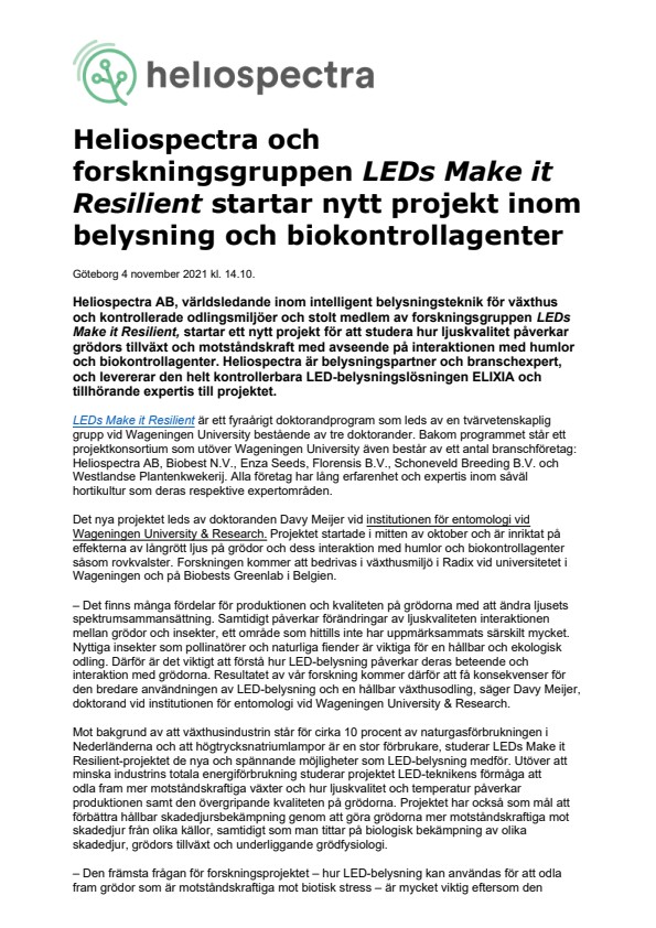 Heliospectra AB, världsledande inom intelligent belysningsteknik för växthus och kontrollerade odlingsmiljöer och stolt medlem av forskningsgruppen LEDs Make it Resilient, startar ett nytt projekt för att studera hur ljuskvalitet påverkar grödors tillväxt och motståndskraft med avseende på interaktionen med humlor och biokontrollagenter. Heliospectra är belysningspartner och branschexpert, och levererar den helt kontrollerbara LED-belysningslösningen ELIXIA och tillhörande expertis till projektet.