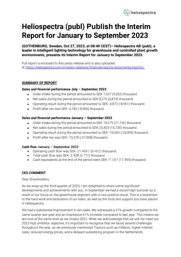 Full report is enclosed to this press release and is also uploaded at https://heliospectra.com/investor-relations/financial-reports-documents/reports/.
