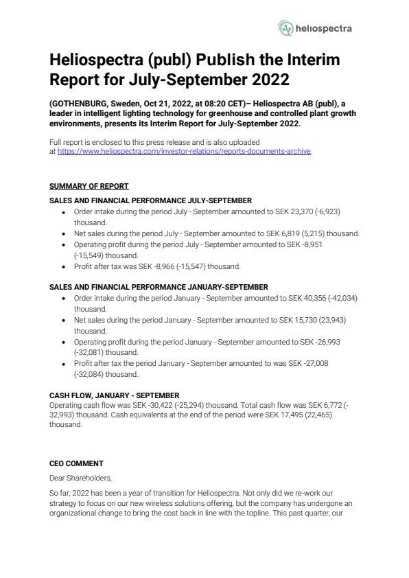 Heliospectra AB (publ), a leader in intelligent lighting technology for greenhouse and controlled plant growth environments, presents its Interim Report for July-September 2022.