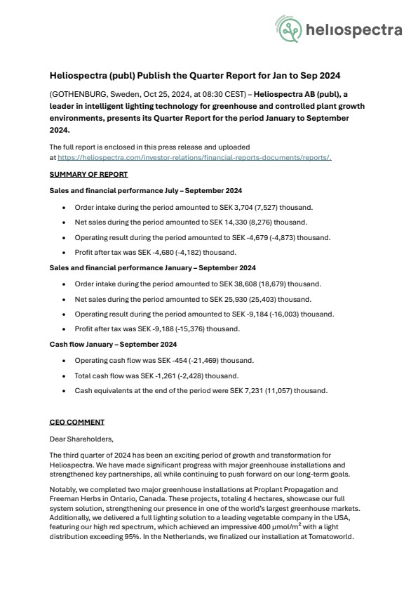 The third quarter of 2024 has been an exciting period of growth and transformation for Heliospectra. We have made significant progress with major greenhouse installations and strengthened key partnerships, all while continuing to push forward on our long-term goals.