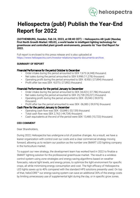 During 2022, Heliospectra has undergone a lot of positive changes. As a result, we have a leaner organization with control over our costs and a clear commercial strategy moving forward, allowing us to reclaim our position as the number one SMART LED lighting company in the horticulture market.