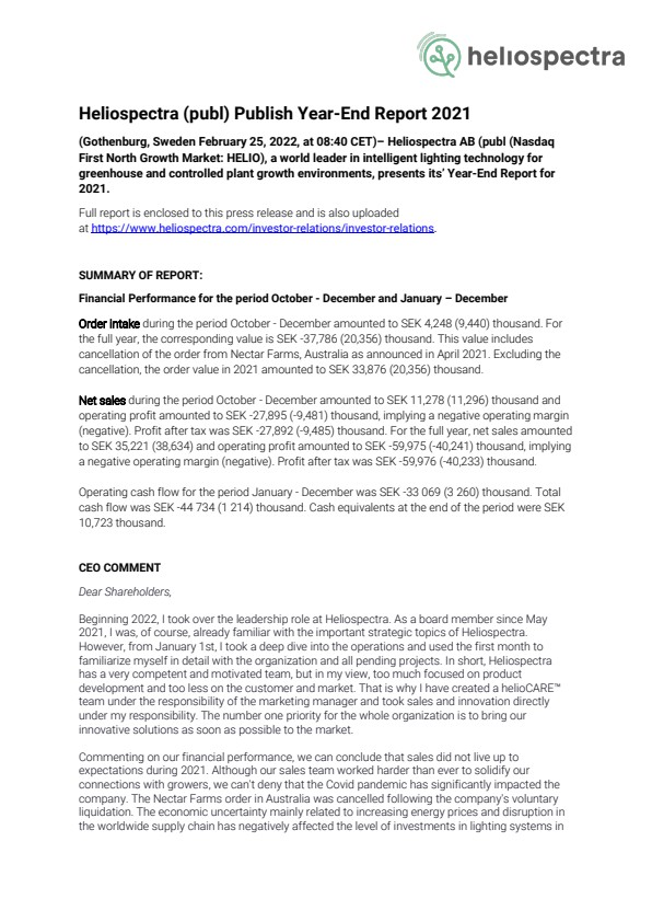 (Gothenburg, Sweden February 25, 2022, at 08:45 CET)– Heliospectra AB (publ (Nasdaq First North Growth Market: HELIO), a leader in intelligent lighting technology for greenhouse and controlled plant growth environments, presents its’ Year-End Report for 2021.