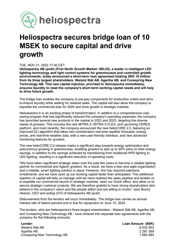 “Heliospectra is embarking on an exciting path of transformation, driven by a new CEO and a strategic vision that holds great promise. As Chairman of the Board and representative of one of the main owners, I am thrilled to see the company’s progress and we are confident that this bridge loan will be a pivotal step towards realizing our shared vision for the future,” says Andreas Gunnarsson, Chairman of the Board of Heliospectra AB (publ) and representative of Corespring New Technology AB.