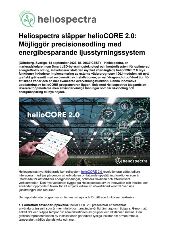 “Heliospectra är stolta över att introducera helioCORE 2.0, ett bevis på vår hängivenhet att driva gränserna för smart LED-belysningsteknologi. Denna version av vår uppdaterade programvara ger odlare möjlighet att fatta datadrivna beslut för att optimera grödans kvalitet och samtidigt förbättra effektiviteten i sin odling, vilket minskar energiförbrukningen med upp till 35 %, utöver besparingarna som redan uppnås genom övergången till LED,” säger Johan Rubenson, CTO på Heliospectra.
