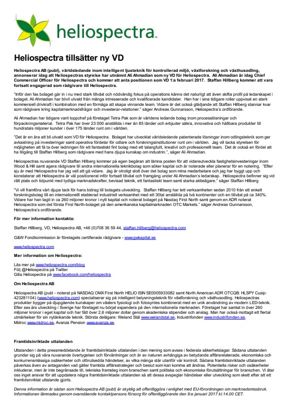 Heliospectras nuvarande VD Staffan Hillberg kommer på egen begäran att lämna posten för att vidareutveckla fastighetsinvesteringar inom Wood & Hill samt agera rådgivare till andra internationella teknikbolag som söker kapital och är noterade eller planerar för en notering. ”Efter sju år med Heliospectra har jag valt att gå vidare. Jag är otroligt stolt över det bolag som mina medarbetare och jag har byggt upp och konstaterar att Heliospectra är väl positionerat inför fortsatt tillväxt och framgång under Ali Ahmadian’s ledarskap. Heliospectra befinner sig vid rätt plats och tidpunkt med tydliga marknadskrafter, bevisad teknik, ett fantastiskt team samt starka aktieägare.” säger Staffan Hillberg