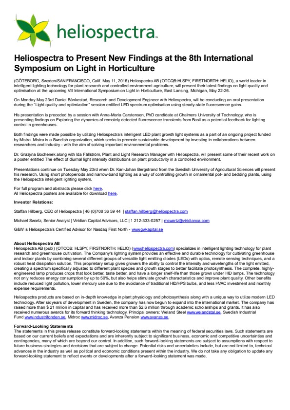 On Monday May 23rd Daniel Bånkestad, Research and Development Engineer with Heliospectra, will be conducting an oral presentation during the “Light quality and optimization” session entitled LED spectrum optimisation using steady-state fluorescence gains.