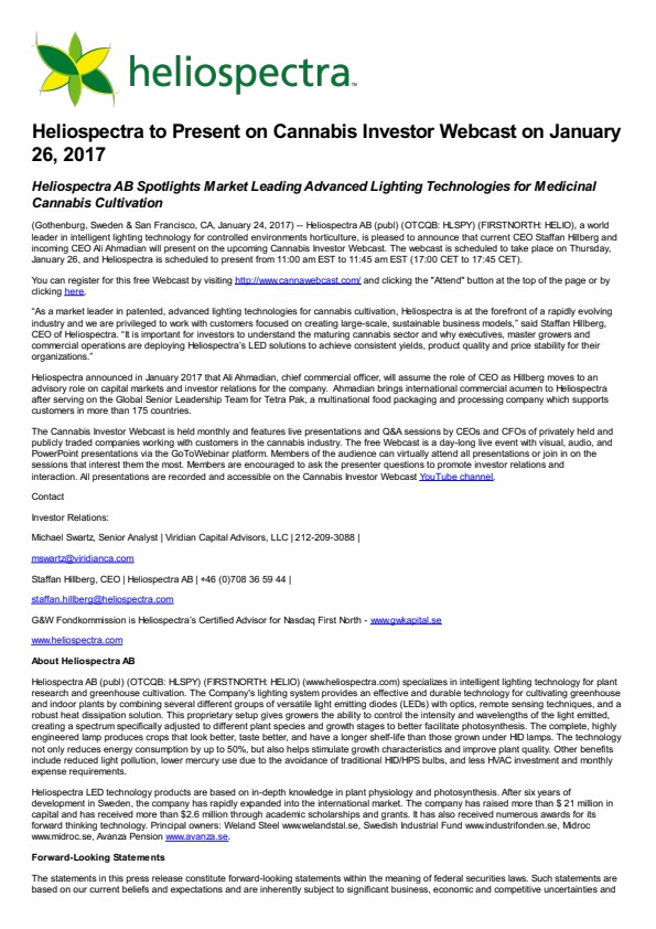 (Gothenburg, Sweden & San Francisco, CA, January 24, 2017) — Heliospectra AB (publ) (OTCQB: HLSPY) (FIRSTNORTH: HELIO), a world leader in intelligent lighting technology for controlled environments horticulture, is pleased to announce that current CEO Staffan Hillberg and incoming CEO Ali Ahmadian will present on the upcoming Cannabis Investor Webcast. The webcast is scheduled to take place on Thursday, January 26, and Heliospectra is scheduled to present from 11:00 am EST to 11:45 am EST (17:00 CET to 17:45 CET).