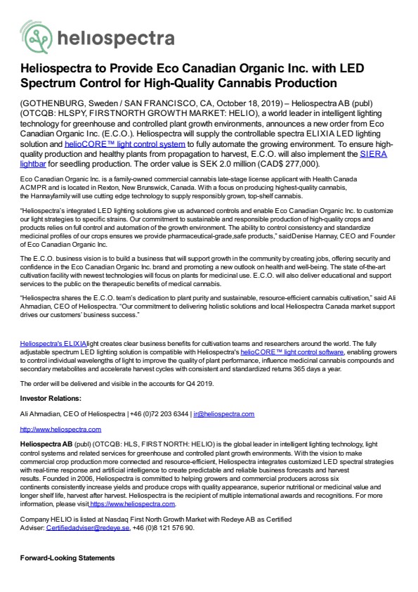 “Heliospectra shares the E.C.O. team’s dedication to plant purity and sustainable, resource-efficient cannabis cultivation,” said Ali Ahmadian, CEO of Heliospectra. “Our commitment to delivering holistic solutions and local Heliospectra Canada market support drives our customers’ business success.”