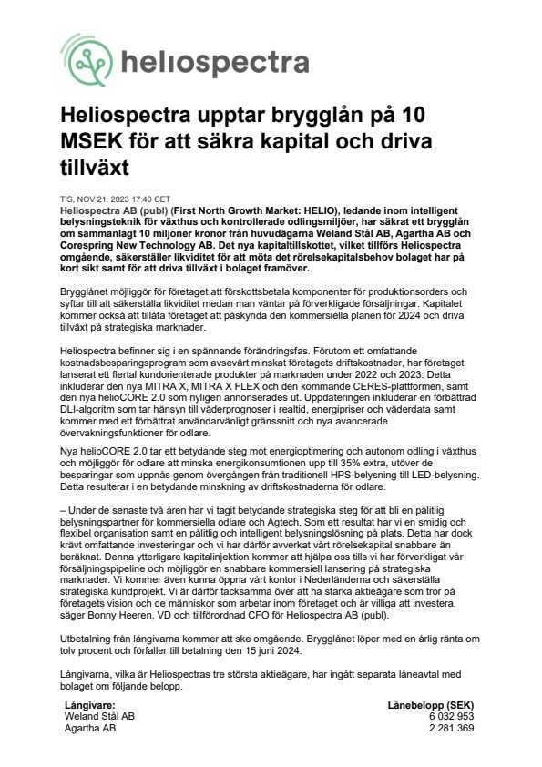 Heliospectra AB (publ) (First North Growth Market: HELIO), ledande inom intelligent belysningsteknik för växthus och kontrollerade odlingsmiljöer, har säkrat ett brygglån om sammanlagt 10 miljoner kronor från huvudägarna Weland Stål AB, Agartha AB och Corespring New Technology AB. Det nya kapitaltillskottet, vilket tillförs Heliospectra omgående, säkerställer likviditet för att möta det rörelsekapitalsbehov bolaget har på kort sikt samt för att driva tillväxt i bolaget framöver.