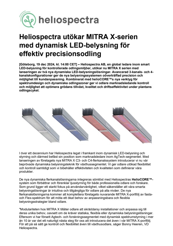 I över ett decennium har Heliospectra legat i framkant inom dynamisk LED-belysning och styrning och därmed befäst sin position som marknadsledare inom AgTech-segmentet. Med lanseringen av företagets nya MITRA X C3- och C4-flerkanalssystem introducerar vi nu vår beprövade dynamiska belysningsteknik för växthussegmentet. Vi ger odlare utökad flexibilitet och kontroll samtidigt som vi bibehåller effektiviteten och kvaliteten som definierar våra produkter.