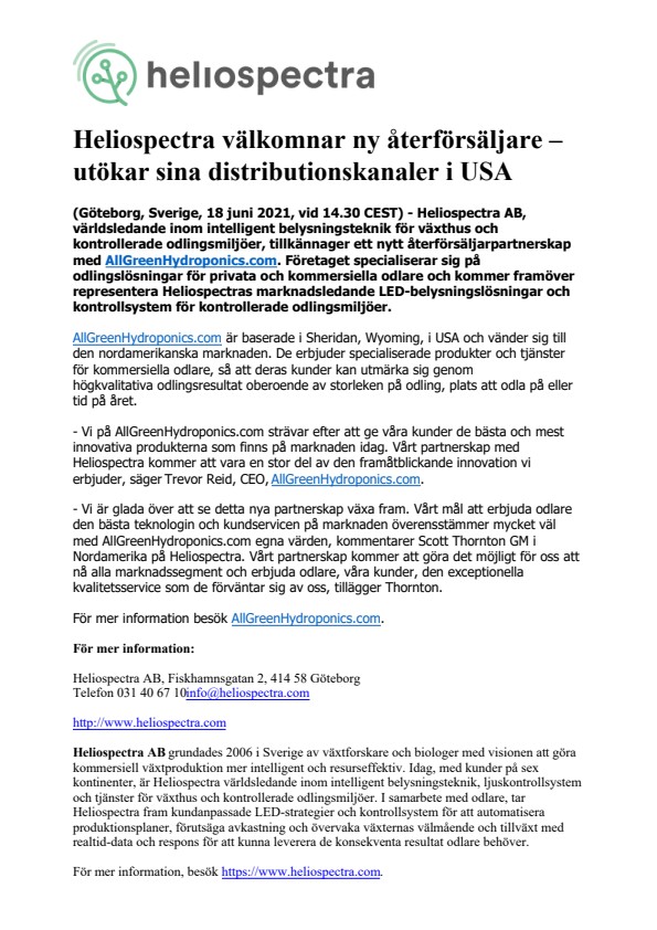 (Göteborg, Sverige, 18 juni 2021, vid 14.30 CEST) – Heliospectra AB, världsledande inom intelligent belysningsteknik för växthus och kontrollerade odlingsmiljöer, tillkännager ett nytt återförsäljarpartnerskap med AllGreenHydroponics.com. Företaget specialiserar sig på odlingslösningar för privata och kommersiella odlare och kommer framöver representera Heliospectras marknadsledande LED-belysningslösningar och kontrollsystem för kontrollerade odlingsmiljöer.