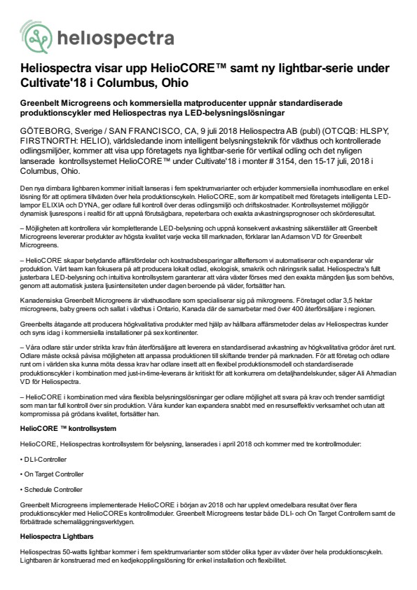 GÖTEBORG, Sverige / SAN FRANCISCO, CA, 9 juli 2018 Heliospectra AB (publ) (OTCQB: HLSPY, FIRSTNORTH: HELIO), världsledande inom intelligent belysningsteknik för växthus och kontrollerade odlingsmiljöer, kommer att visa upp företagets nya lightbar-serie för vertikal odling och det nyligen lanserade kontrollsystemet HelioCORE™ under Cultivate’18 i monter # 3154, den 15-17 juli, 2018 i Columbus, Ohio.