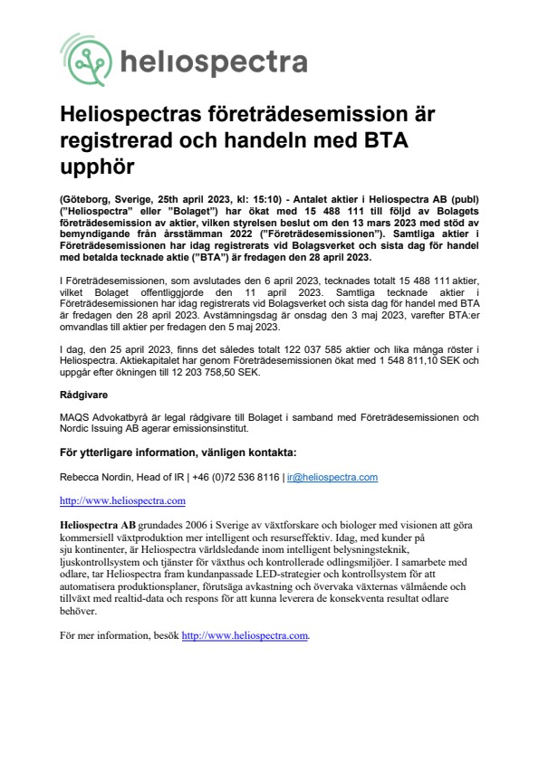 I dag, den 25 april 2023, finns det således totalt 122 037 585 aktier och lika många röster i Heliospectra. Aktiekapitalet har genom Företrädesemissionen ökat med 1 548 811,10 SEK och uppgår efter ökningen till 12 203 758,50 SEK.