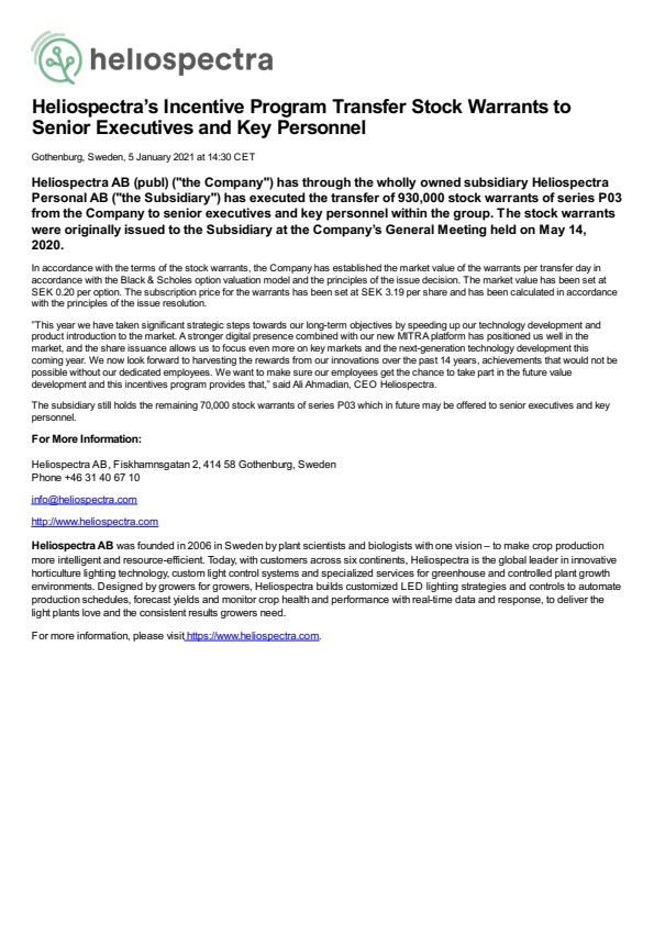 Heliospectra AB (publ) (“the Company”) has through the wholly owned subsidiary Heliospectra Personal AB (“the Subsidiary”) has executed the transfer of 930,000 stock warrants of series P03 from the Company to senior executives and key personnel within the group. The stock warrants were originally issued to the Subsidiary at the Company’s General Meeting held on May 14, 2020.