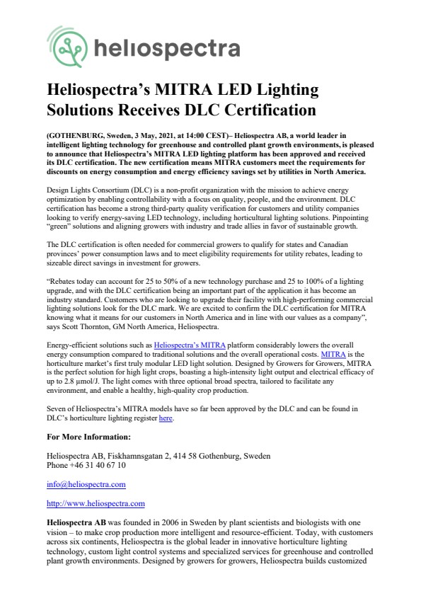 “Rebates today can account for 25 to 50% of a new technology purchase and 25 to 100% of a lighting upgrade, and with the DLC certification being an important part of the application it has become an industry standard. Customers who are looking to upgrade their facility with high-performing commercial lighting solutions look for the DLC mark. We are excited to confirm the DLC certification for MITRA knowing what it means for our customers in North America and in line with our values as a company”, says Scott Thornton, GM North America, Heliospectra.
