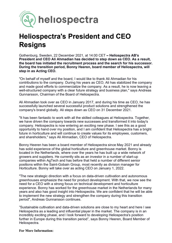 “On behalf of myself and the board, I would like to thank Ali Ahmadian for his contributions to the company. During his years as CEO, Ali has stabilized the company and made good efforts to commercialize the company. As a result, he is now leaving a well-structured company with a clear future strategy and business plan,” says Andreas Gunnarsson, Chairman of the Board of Heliospectra.