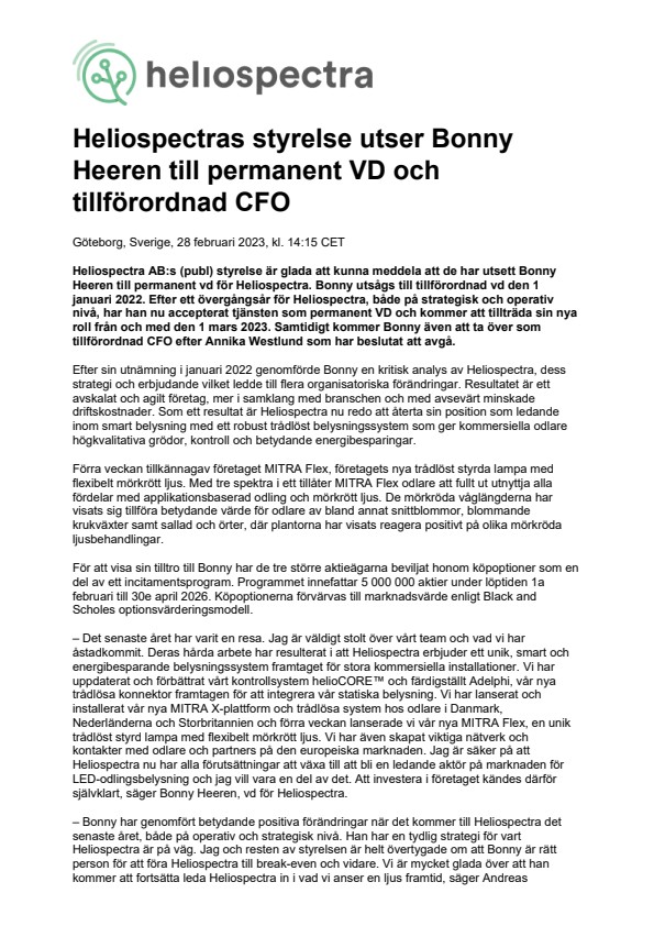 Heliospectra AB:s (publ) styrelse är glada att kunna meddela att de har utsett Bonny Heeren till permanent vd för Heliospectra. Bonny utsågs till tillförordnad vd den 1 januari 2022. Efter ett övergångsår för Heliospectra, både på strategisk och operativ nivå, har han nu accepterat tjänsten som permanent VD och kommer att tillträda sin nya roll från och med den 1 mars 2023. Samtidigt kommer Bonny även att ta över som tillförordnad CFO efter Annika Westlund som har beslutat att avgå.