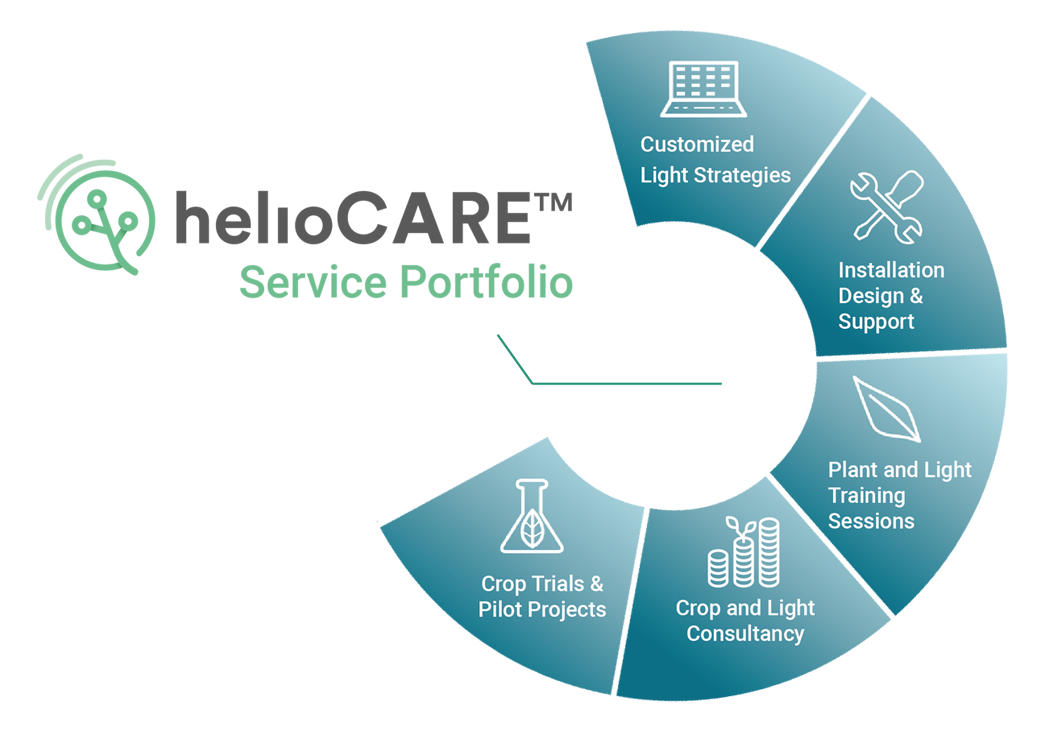 Tjänster som nu kommer att omfattas under helioCARE™ inkluderar: ljusanalyser, ljusplanering och anpassade ljusstrategier, installationsdesign och installationssupport, utbildningar inom växt och ljus optimering för odling, växt- och ljuskonsultationer samt kommersiell växtforskning och pilotprojekt.