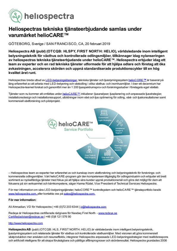 Heliospectra AB (publ) (OTCQB: HLSPY, FIRST NORTH: HELIO), världsledande inom intelligent belysningsteknik för växthus och kontrollerade odlingsmiljöer, tillkännager idag nylanseringen av heliospectras tekniska tjänsteerbjudande under helioCARE™. Heliospectra erbjuder idag ett team av experter och en rad tekniska tjänster utformade för att hjälpa odlare och företag att öka avkastningen, accelerera skörden och uppnå standardiserade produktionscykler till en hög kvalitet året runt.