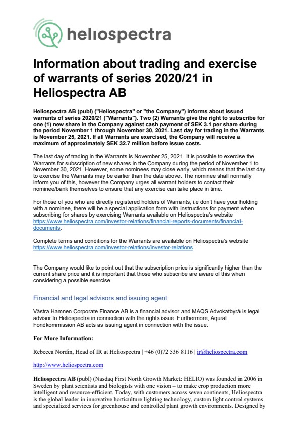 Complete terms and conditions for the Warrants are available on Heliospectra’s website https://www.heliospectra.com/investor-relations/investor-relations.