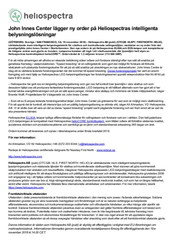 – Som ett av Europas ledande forskningsinstitut tänjer John Innes Center på gränserna för vad som är möjligt inom växtforskning. För att uppnå det är kontroll, ett intensivt ljus och en pålitlig belysningslösning av största vikt, säger Ali Ahmadian, VD Heliospectra AB. Vi är stolta över att vara en del av deras ”speed breeding”-projekt samt pågående forskning och ser fram emot att se vad de ska presentera härnäst.