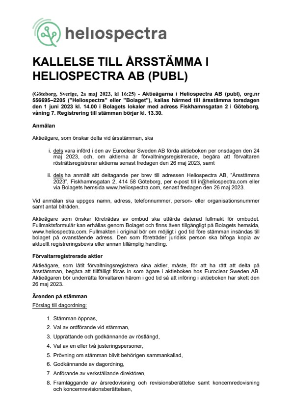 - dels ha anmält sitt deltagande per brev till adressen Heliospectra AB, ”Årsstämma 2023”, Fiskhamnsgatan 2, 414 58 Göteborg, per e-post till ir@heliospectra.com eller via Bolagets hemsida www.heliospectra.com, senast fredagen den 26 maj 2023.