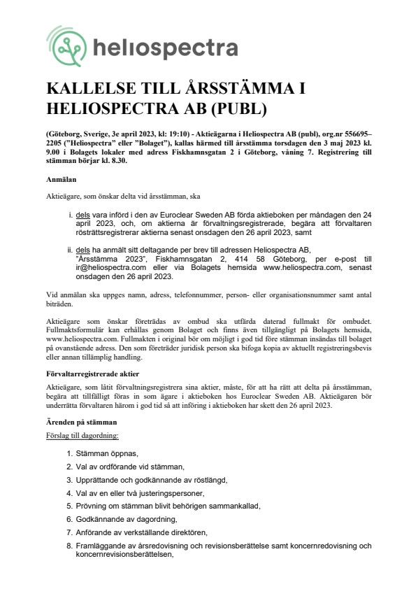 ”Årsstämma 2023”, Fiskhamnsgatan 2, 414 58 Göteborg, per e-post till ir@heliospectra.com eller via Bolagets hemsida www.heliospectra.com, senast onsdagen den 26 april 2023.