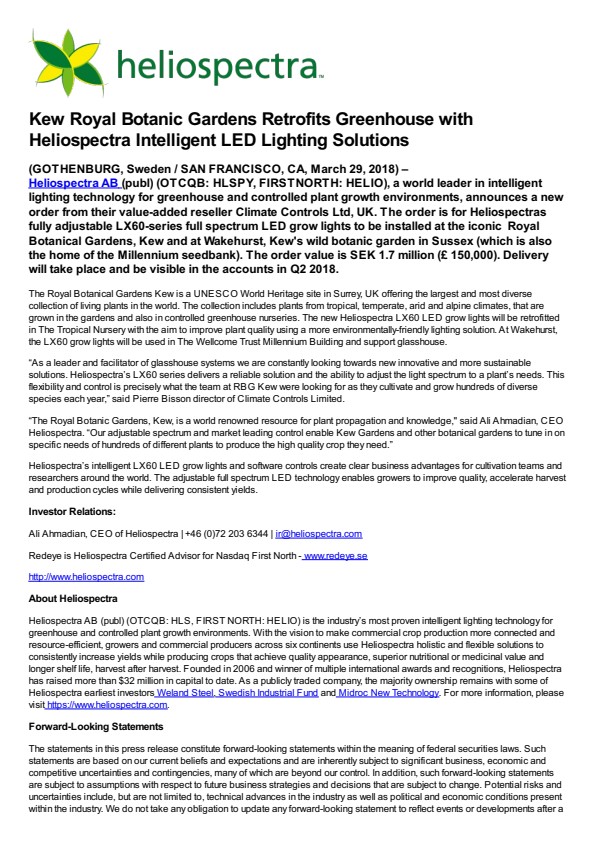 Heliospectra AB (https://www.heliospectra.com/) (https://www.heliospectra.com/)(publ) (OTCQB: HLSPY, FIRSTNORTH: HELIO), a world leader in intelligent lighting technology for greenhouse and controlled plant growth environments, announces a new order from their value-added reseller Climate Controls Ltd, UK. The order is for Heliospectras fully adjustable LX60-series full spectrum LED grow lights to be installed at the iconic Royal Botanical Gardens, Kew and at Wakehurst, Kew’s wild botanic garden in Sussex (which is also the home of the Millennium seedbank). The order value is SEK 1.7 million (£ 150,000). Delivery will take place and be visible in the accounts in Q2 2018.