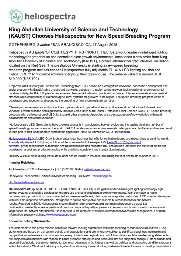 Heliospectra AB (publ) (OTCQB: HLSPY, FIRSTNORTH: HELIO), a world leader in intelligent lighting technology for greenhouse and controlled plant growth environments, announces a new order from King Abdullah University of Science and Technology (KAUST), a private international graduate-level institution located on the Red Sea. The prestigious University is starting a new speed breeding research program and has chosen Heliospectra’s fully adjustable ELIXIA LED lighting solution and HelioCORE™ light control software to light up their greenhouse. The order is valued at around SEK 540,000 ($ 58,700).