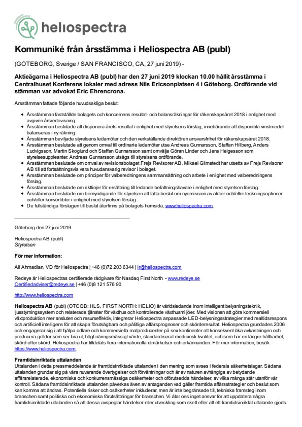 Aktieägarna i Heliospectra AB (publ) har den 27 juni 2019 klockan 10.00 hållit årsstämma i Centralhuset Konferens lokaler med adress Nils Ericsonplatsen 4 i Göteborg. Ordförande vid stämman var advokat Eric Ehrencrona.