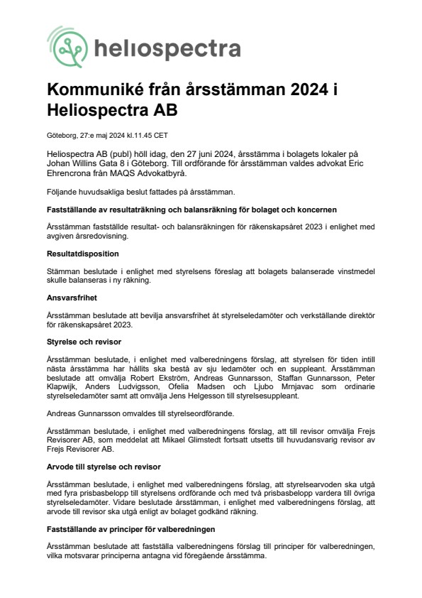 Heliospectra AB (publ) höll idag, den 27 juni 2024, årsstämma i bolagets lokaler på Johan Willins Gata 8 i Göteborg. Till ordförande för årsstämman valdes advokat Eric Ehrencrona från MAQS Advokatbyrå.