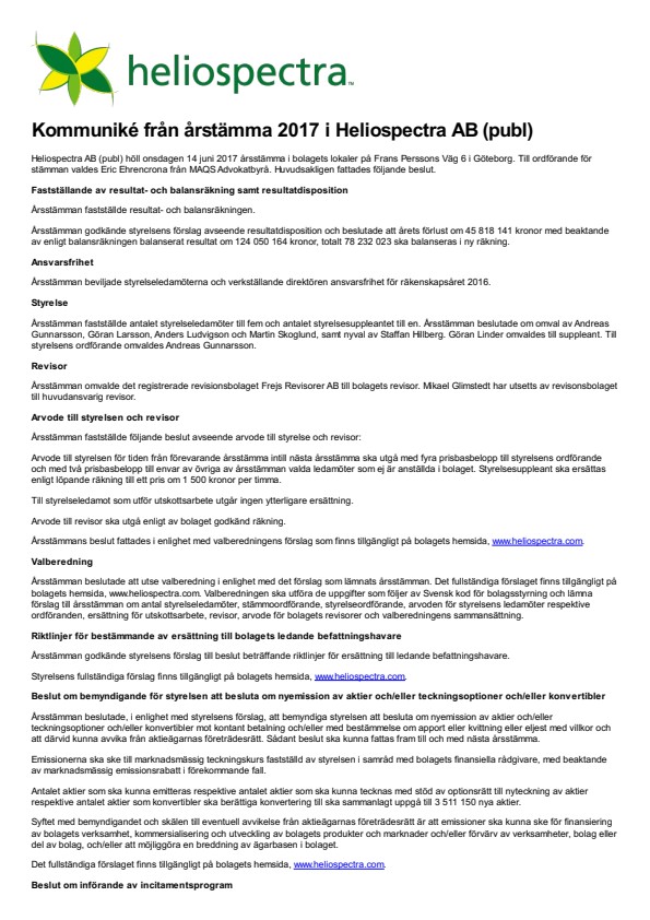 Heliospectra AB (publ) höll onsdagen 14 juni 2017 årsstämma i bolagets lokaler på Frans Perssons Väg 6 i Göteborg. Till ordförande för stämman valdes Eric Ehrencrona från MAQS Advokatbyrå. Huvudsakligen fattades följande beslut.