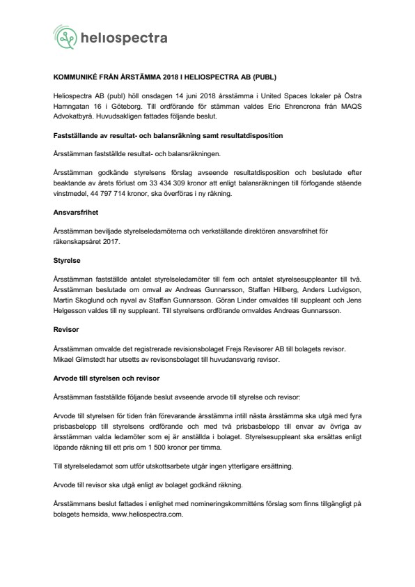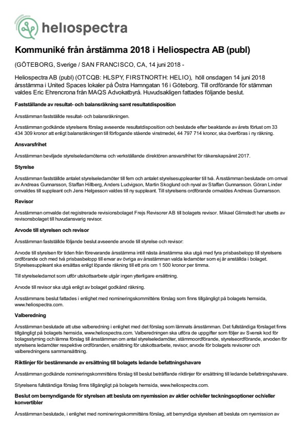Heliospectra AB (publ) (OTCQB: HLSPY, FIRSTNORTH: HELIO), höll onsdagen 14 juni 2018 årsstämma i United Spaces lokaler på Östra Hamngatan 16 i Göteborg. Till ordförande för stämman valdes Eric Ehrencrona från MAQS Advokatbyrå. Huvudsakligen fattades följande beslut.