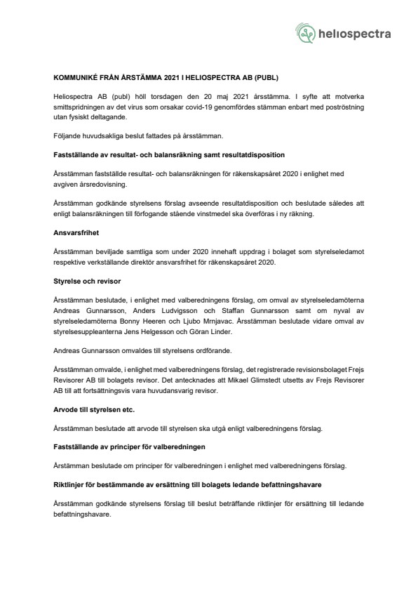 Heliospectra AB (publ) höll torsdagen den 20 maj 2021 årsstämma. I syfte att motverka smittspridningen av det virus som orsakar covid-19 genomfördes stämman enbart med poströstning utan fysiskt deltagande.