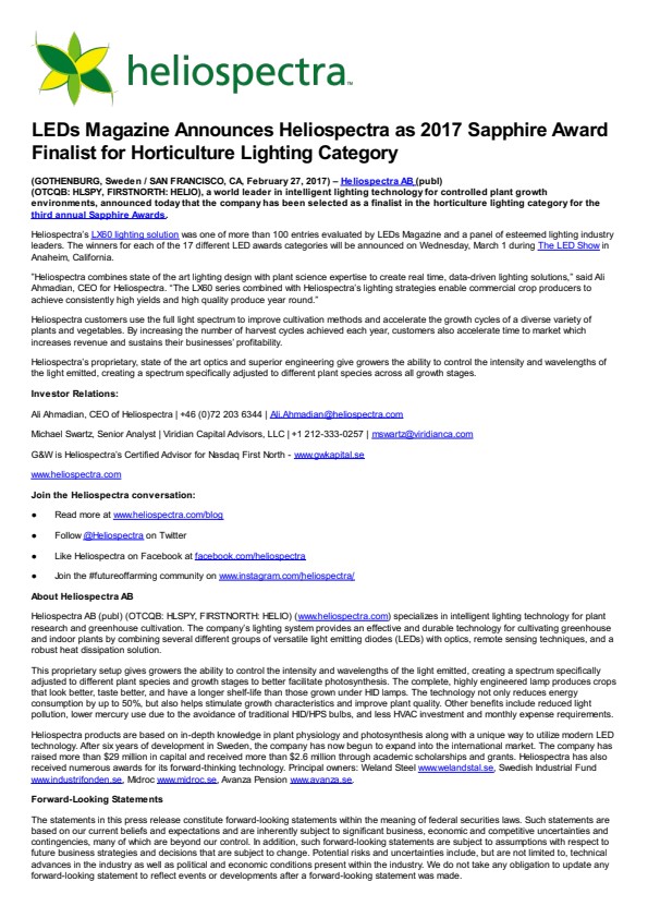 Heliospectra’s LX60 lighting solution was one of more than 100 entries evaluated by LEDs Magazine and a panel of esteemed lighting industry leaders. The winners for each of the 17 different LED awards categories will be announced on Wednesday, March 1 during The LED Show in Anaheim, California.