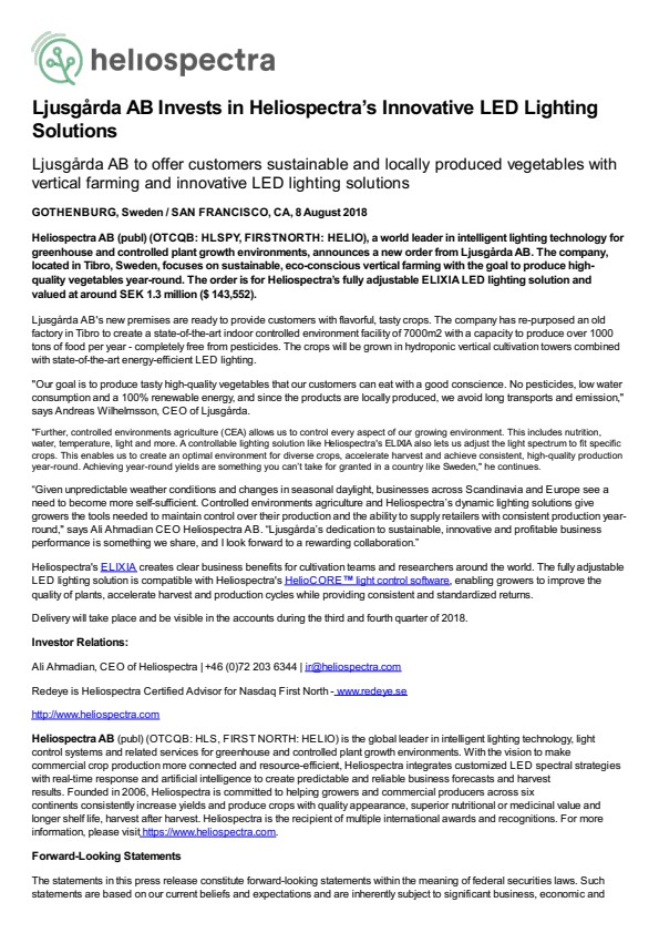 Heliospectra AB (publ) (OTCQB: HLSPY, FIRSTNORTH: HELIO), a world leader in intelligent lighting technology for greenhouse and controlled plant growth environments, announces a new order from Ljusgårda AB. The company, located in Tibro, Sweden, focuses on sustainable, eco-conscious vertical farming with the goal to produce high-quality vegetables year-round. The order is for Heliospectra’s fully adjustable ELIXIA LED lighting solution and valued at around SEK 1.3 million ($ 143,552).