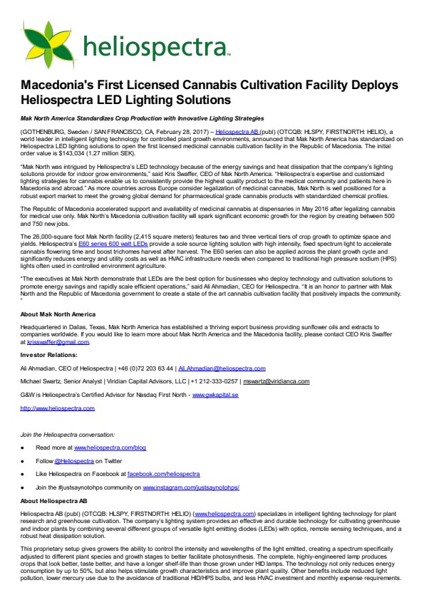 (GOTHENBURG, Sweden / SAN FRANCISCO, CA, February 28, 2017) – Heliospectra AB (https://www.heliospectra.com/) (https://www.heliospectra.com/)(publ) (OTCQB: HLSPY, FIRSTNORTH: HELIO), a world leader in intelligent lighting technology for controlled plant growth environments, announced that Mak North America has standardized on Heliospectra LED lighting solutions to open the first licensed medicinal cannabis cultivation facility in the Republic of Macedonia. The initial order value is $143,034 (1.27 million SEK).