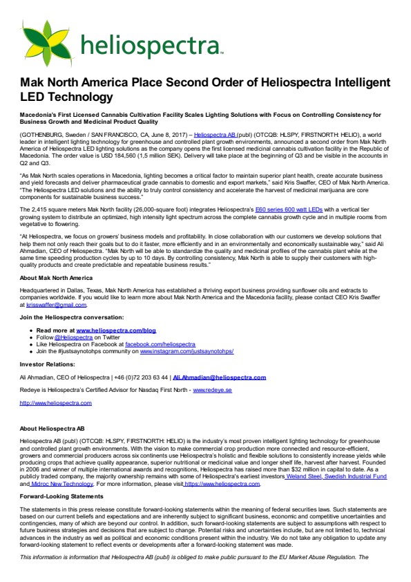 (GOTHENBURG, Sweden / SAN FRANCISCO, CA, June 8, 2017) – Heliospectra AB (https://www.heliospectra.com/)(publ) (OTCQB: HLSPY, FIRSTNORTH: HELIO), a world leader in intelligent lighting technology for greenhouse and controlled plant growth environments, announced a second order from Mak North America of Heliospectra LED lighting solutions as the company opens the first licensed medicinal cannabis cultivation facility in the Republic of Macedonia. The order value is USD 184,560 (1,5 million SEK). Delivery will take place at the beginning of Q3 and be visible in the accounts in Q2 and Q3.