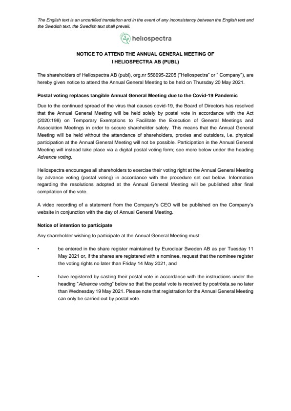 Shareholders may only exercise their voting rights at the Annual General meeting by voting in advance by digital postal voting. For advance voting, shareholders must use a digital form, which will be available on the Company’s website, www.heliospectra.com, in due time prior to the Annual General Meeting. The voting form must be completed and submitted to poströsta.se no later than Wednesday 19 May 2021. A shareholder who exercises his voting right by advance voting does not need to register specifically for the Annual General Meeting, as submission of the voting form shall be valid as notification.