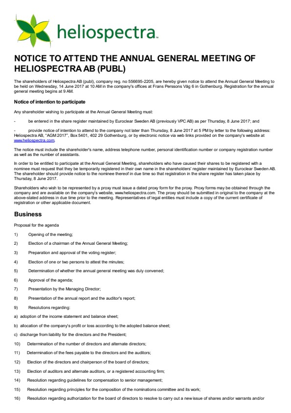Proposals for resolutions under items 2 and 10 – 18 will be made available to the shareholders at the company’s offices, as well as on the company’s website www.heliospectra.com commencing on Wednesday, 17 May 2017. The annual report and auditor’s report for the 1 January 2016 – 31 December 2016 financial year will be made available to shareholders at the company’s offices as well as on the company’s website, commencing on Wednesday, 17 May 2017. All other documents that must be available pursuant to law will be sent to any shareholders who requests such from the company and provide their address. All documents will also be available at the Annual General Meeting.