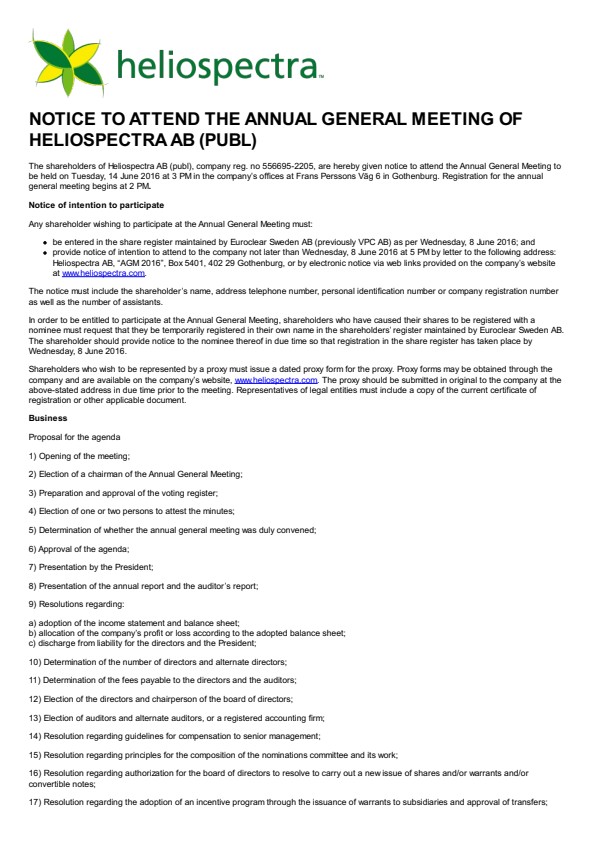 - provide notice of intention to attend to the company not later than Wednesday, 8 June 2016 at 5 PM by letter to the following address: Heliospectra AB, “AGM 2016”, Box 5401, 402 29 Gothenburg, or by electronic notice via web links provided on the company’s website at www.heliospectra.com.