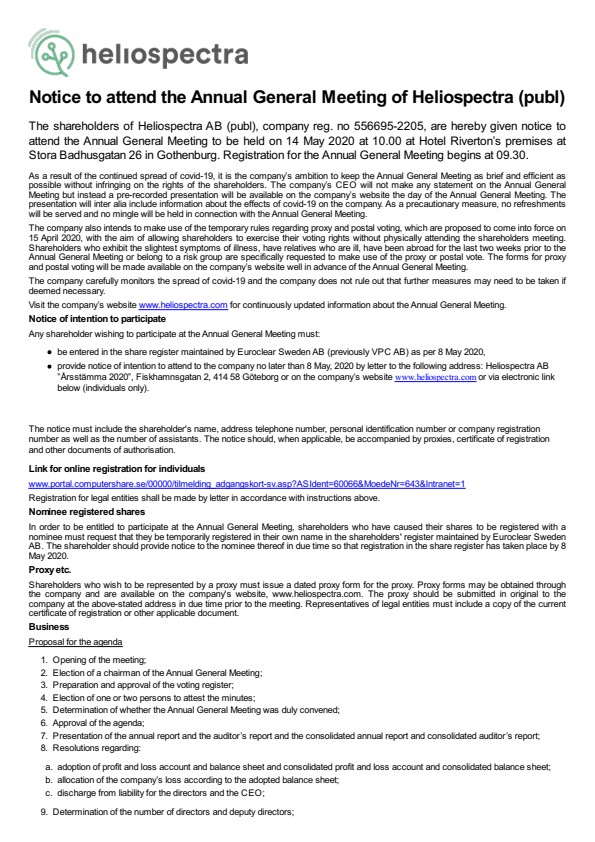 Visit the company’s website www.heliospectra.com for continuously updated information about the Annual General Meeting.