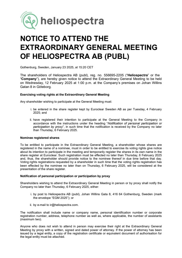 The shareholders of Heliospectra AB (publ), reg. no. 556695-2205 (“Heliospectra” or the “Company”), are hereby given notice to attend the Extraordinary General Meeting to be held on Wednesday, 12 February 2025 at 1:00 p.m. at the Company’s premises on Johan Willins Gatan 8 in Göteborg.