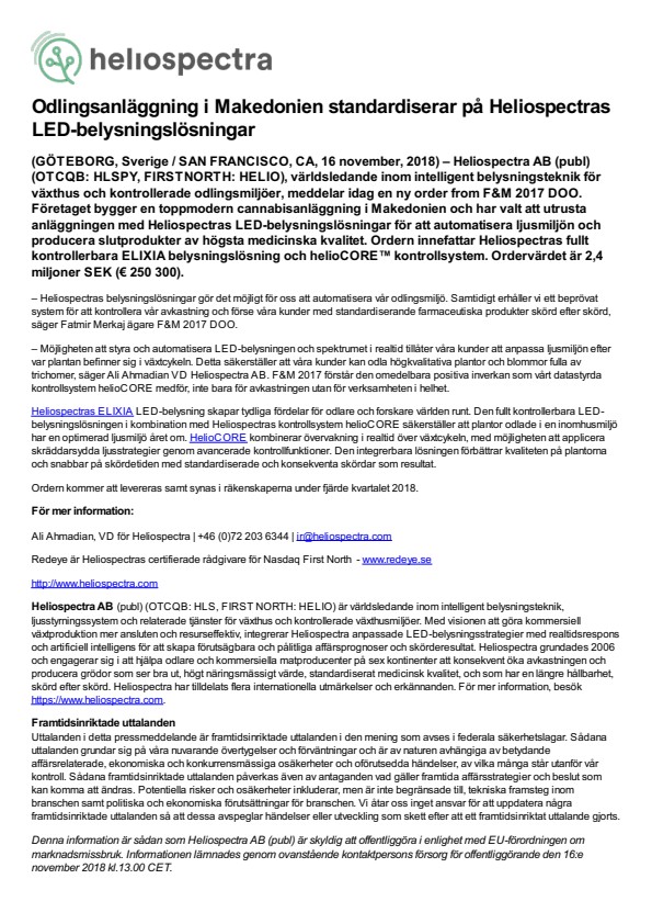 (GÖTEBORG, Sverige / SAN FRANCISCO, CA, 16 november, 2018) – Heliospectra AB (publ) (OTCQB: HLSPY, FIRSTNORTH: HELIO), världsledande inom intelligent belysningsteknik för växthus och kontrollerade odlingsmiljöer, meddelar idag en ny order from F&M 2017 DOO. Företaget bygger en toppmodern cannabisanläggning i Makedonien och har valt att utrusta anläggningen med Heliospectras LED-belysningslösningar för att automatisera ljusmiljön och producera slutprodukter av högsta medicinska kvalitet. Ordern innefattar Heliospectras fullt kontrollerbara ELIXIA belysningslösning och helioCORE™ kontrollsystem. Ordervärdet är 2,4 miljoner SEK (€ 250 300).