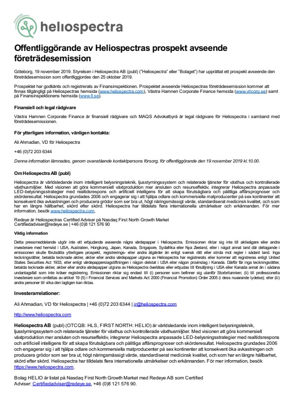 Göteborg, 19 november 2019. Styrelsen i Heliospectra AB (publ) (”Heliospectra” eller ”Bolaget”) har upprättat ett prospekt avseende den företrädesemission som offentliggjordes den 25 oktober 2019.
