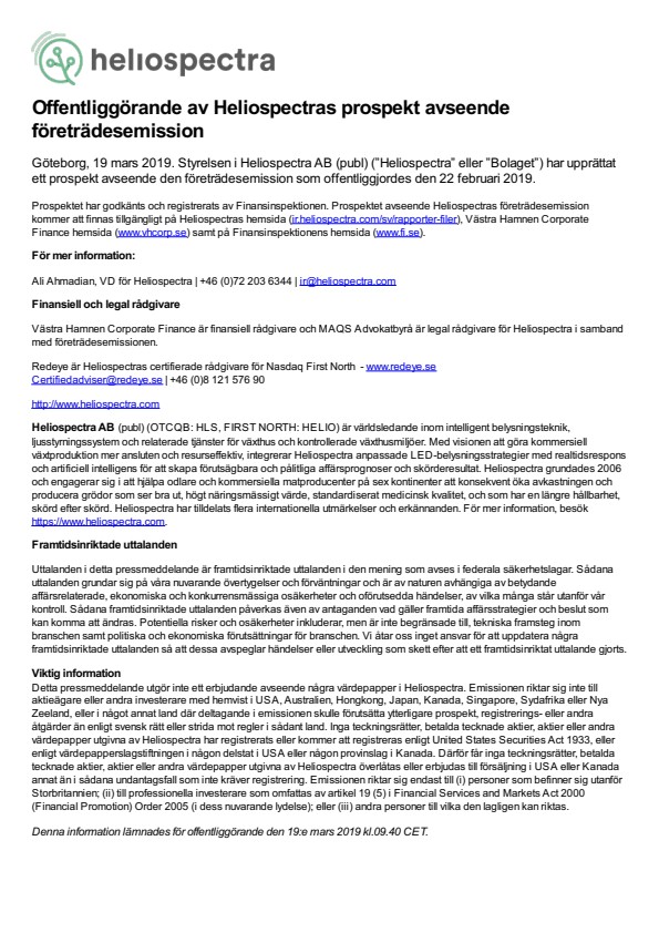 Prospektet har godkänts och registrerats av Finansinspektionen. Prospektet avseende Heliospectras företrädesemission kommer att finnas tillgängligt på Heliospectras hemsida (ir.heliospectra.com/sv/rapporter-filer), Västra Hamnen Corporate Finance hemsida (www.vhcorp.se) samt på Finansinspektionens hemsida (www.fi.se).