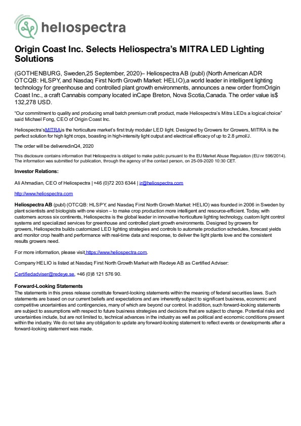(GOTHENBURG, Sweden, 25 September, 2020)– Heliospectra AB (publ) (North American ADR OTCQB: HLSPY, and Nasdaq First North Growth Market: HELIO), a world leader in intelligent lighting technology for greenhouse and controlled plant growth environments, announces a new order from Origin Coast Inc., a craft Cannabis company located in Cape Breton, Nova Scotia, Canada. The order value is $ 132,278 USD.