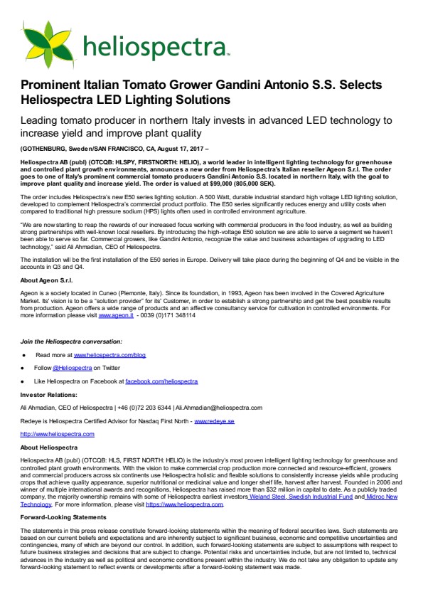 Heliospectra AB (publ) (OTCQB: HLSPY, FIRSTNORTH: HELIO), a world leader in intelligent lighting technology for greenhouse and controlled plant growth environments, announces a new order from Heliospectra’s Italian reseller Ageon S.r.l. The order goes to one of Italy’s prominent commercial tomato producers Gandini Antonio S.S. located in northern Italy, with the goal to improve plant quality and increase yield. The order is valued at $99,000 (805,000 SEK).