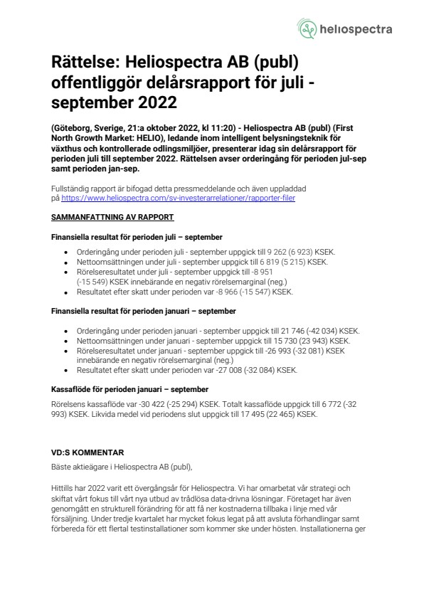 (Göteborg, Sverige, 21:a oktober 2022, kl 11:25) – Heliospectra AB (publ) (First North Growth Market: HELIO), ledande inom intelligent belysningsteknik för växthus och kontrollerade odlingsmiljöer, presenterar idag sin delårsrapport för perioden juli till september 2022. Rättelsen avser orderingång för perioden jul-sep samt perioden jan-sep.